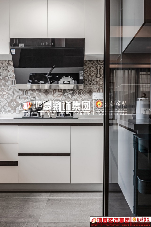 圖8.亮點:廚房采用當下流行的極窄推拉門透明玻璃的設(shè)計,墻面采用花磚設(shè)計,拒絕平庸,使整個空間充滿時尚感。